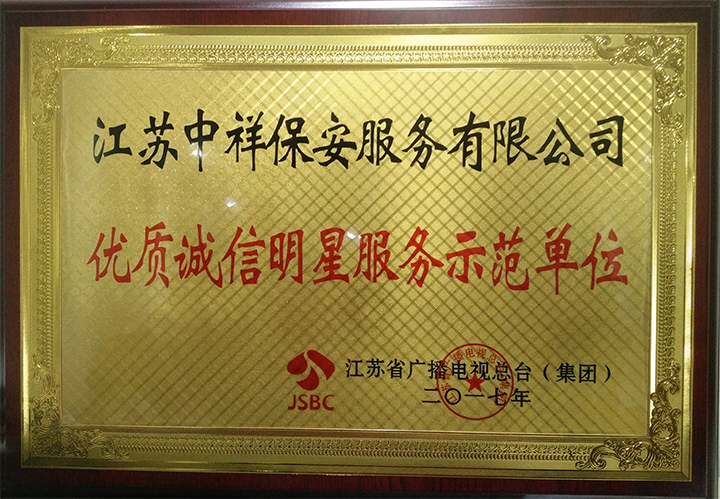 中祥保安公司榮獲江蘇省廣播電視總臺2017年優質誠信明星服務示范單位